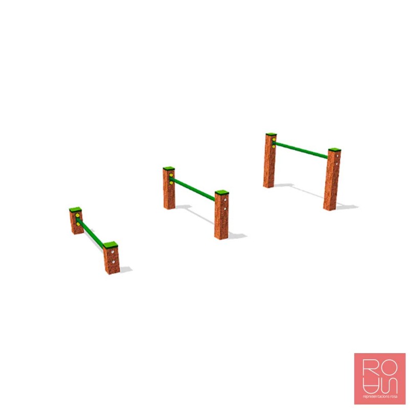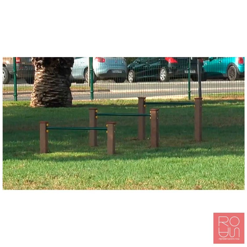 Estructura amb pals de fusta de 90 mm tractats i acabats amb lasur. Panells de polietilè d'alta densitat de 16 mm i cargols M8 x 30, 90,110 i 120. Cubretornillos de color groc. Barra de diàmetre 28 d'acer pintada al forn.