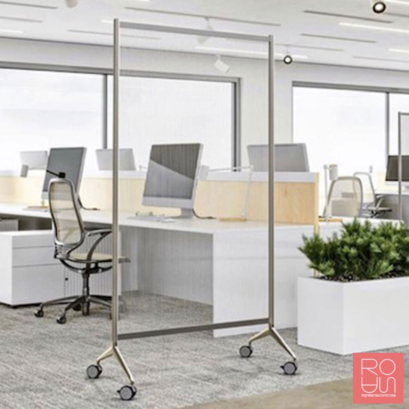 Material: Estructura fabricada en alumini anoditzat en plata mat i peus de fosa d'alumini amb rodes i fre. El panell és de policarbonat acanalat translúcid o transparent.
