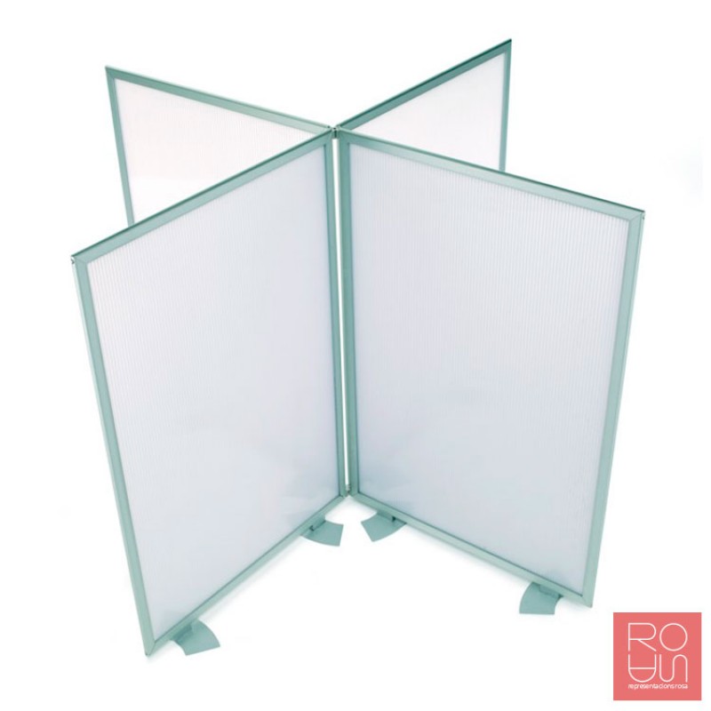 Material: Estructura fabricada en alumini anoditzat en plata mat i peus de fosa d'alumini amb rodes i fre. El panell és de policarbonat acanalat translúcid o transparent.