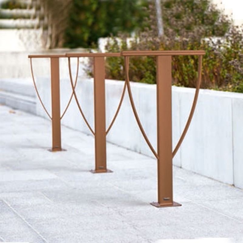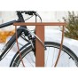 Un aparcabicicletes que ocupa poc espai i permet fixar de forma simultània el quadre i la roda.