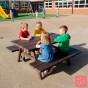Amb unes dimensions de 100 cm de llarg x 120 cm d'ample i una alçada de seient de 51 cm, aquesta taula està perfectament adaptada per a nens de 3 a 7 anys (educació infantil i primers anys de primària). El seu disseny compacte i ergonòmic fomenta la interacció social i el joc a l'aire lliure, oferint un espai còmode i segur per a activitats o berenars.