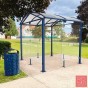 . Estructura del sostre per travessers en tub d'acer de 40x60 mm i canalons en perfil d'alumini. Arcs en perfil d'alumini corbat.