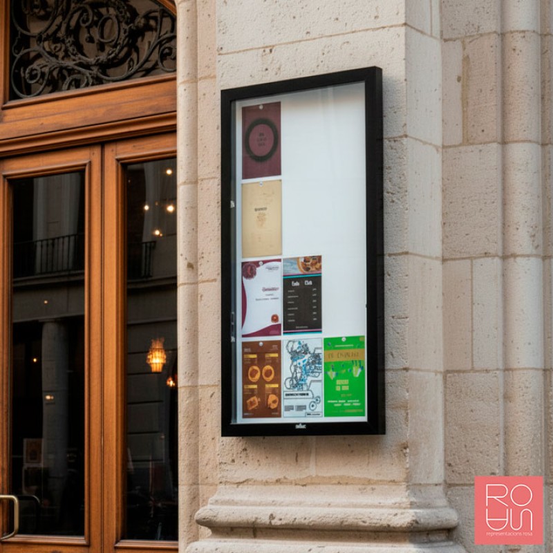Vitrina d'informació Edge amb gruix de 54 mm a paretLa nostra vitrina Edge amb acabat i disseny d'alta gamma, ofereix una solució per a poder veure els documents amb una excel·lent visibilitat gràcies al vidre de seguretat, el seu marc serigrafiat en color negre i el perfil d'alumini extra fi.