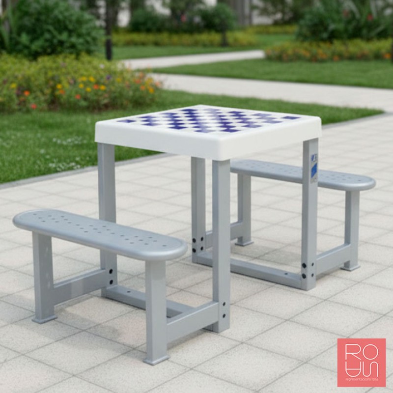 • Taula i Taulell d'Escacs: Construïda amb un robust xassís intern d'acer injectat amb polièster i una gruixuda capa de fibra de vidre tractada amb resines enduridores especials. El taulell d'escacs està embotit al buit, oferint una protecció total contra el deteriorament, la humitat i els impactes. La seva superfície és inalterable, amb un acabat lluminós gràcies a pintures tipus gel-coats i vernís anti-xoc i anti-grafits, assegurant una neteja fàcil i una aparença impecable al llarg del temps.