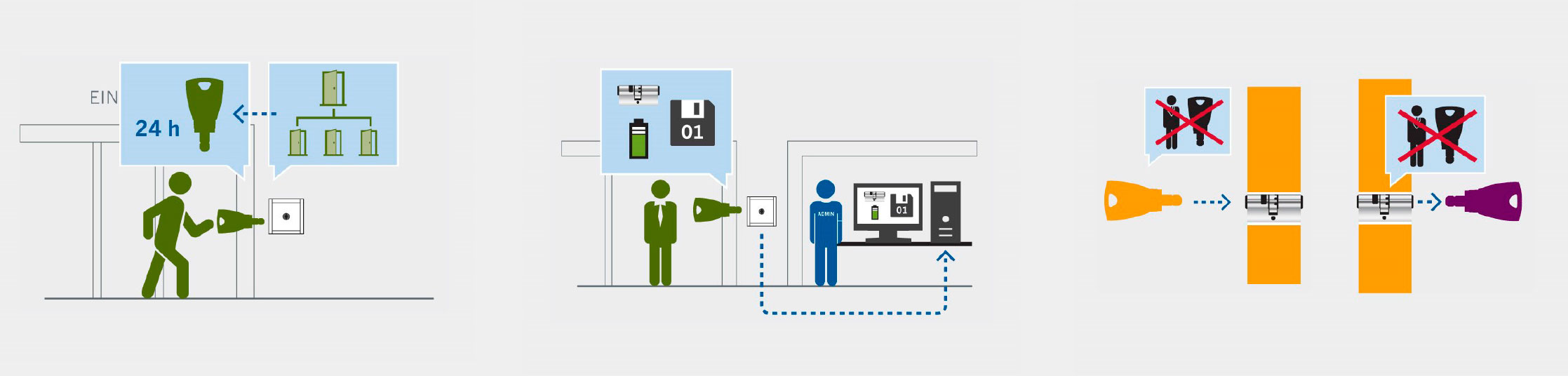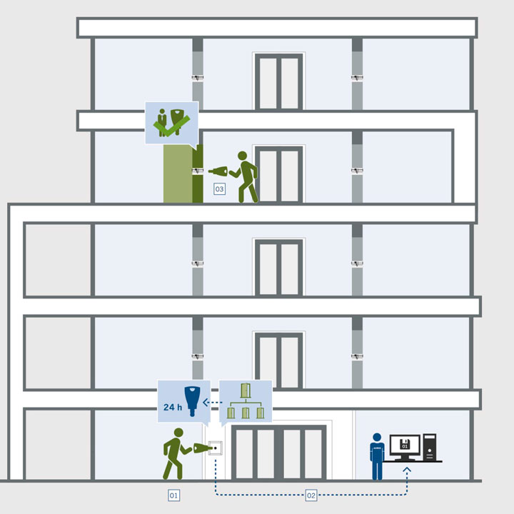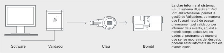El sistema guarda els diferents permisos d'accés en el validador online. Al començament de la jornada, cada usuari descarre-ga el seu perfil d'usuari actualitzat del validador a la seva clau blueSmart. Els nous permisos o bloquejos d'accés es poden comunicar així en poc temps. L‘informació rellevant per al control del sistema, com p. ex. l'estat de les bateries de cada cilin-dre o la recepció de les ordres de les claus, es registren en el servidor central gràcies a un procés de monitorització.